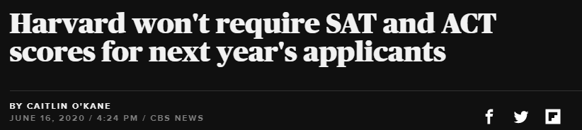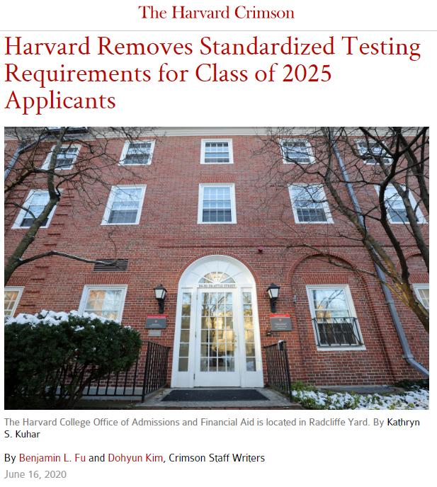 6/15 하버드가 2021 신입생(Class of 2025) 지원자들의 SAT와 ACT 시험 성적을 의무화하지 않고, SAT, ACT 성적을 제출하지 않아도 불이익을 주지 않을거라고 발표했습니다.