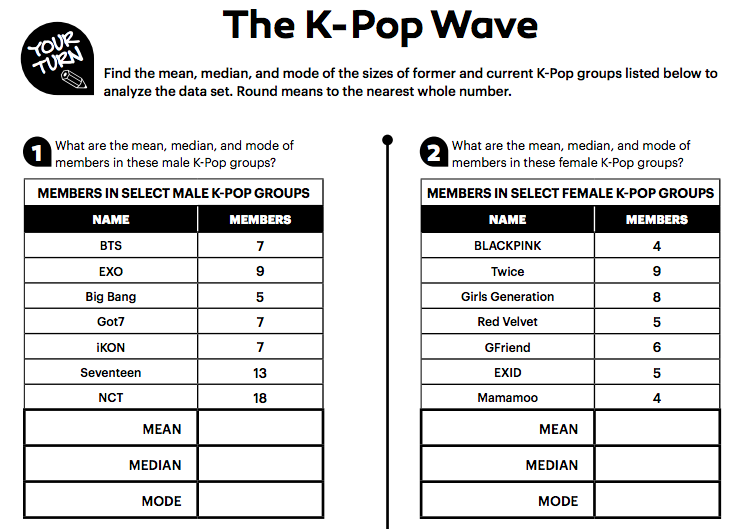 Use mean, media, and mode to learn more about the number of members in different K-Pop groups.
